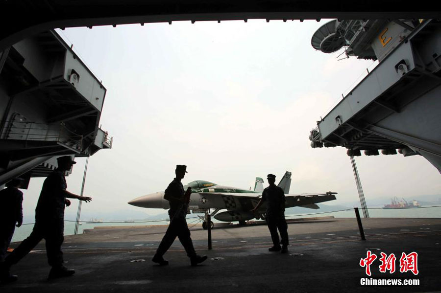 The US Navy's aircraft carrier USS George Washington docks in Hong Kong and welcomes four People's Liberation Army members for a VIP visit on Monday, June 16, 2014. [Photo: Chinanews.com]