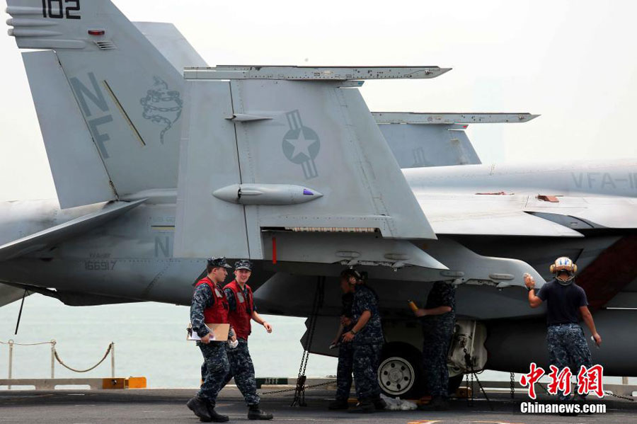 The US Navy's aircraft carrier USS George Washington docks in Hong Kong and welcomes four People's Liberation Army members for a VIP visit on Monday, June 16, 2014. [Photo: Chinanews.com]