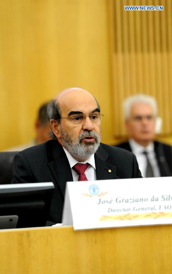 The UN Food and Agricultural Organization(FAO) Secretary General Jose Graziano da Silva delivers a speech during the awarding ceremony at FAO headquarters in Rome, Italy, on June 16,2014. The FAO recognized China's "outstanding progress" against hunger on Monday for having achieved the first Millennium Development Goal(MDG), namely halving the proportion of its undernourished people since 1990. (Xinhua/Xu Nizhi)