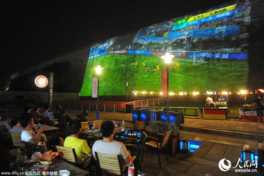 Watching the World Cup at a bar or cinema is no longer new - now, Nanjing citizens can enjoy the broadcast on the Ming Dynasty (1368-1644) city wall. Since the morning of June 13, 2014, the World Cup matches have been broadcasted on the city wall through projectors in Laomendong historical block of Nanjing. Many citizens were attracted here to watch the matches on the "screen" as big as 1,000 square meters.(People's Daily Online)