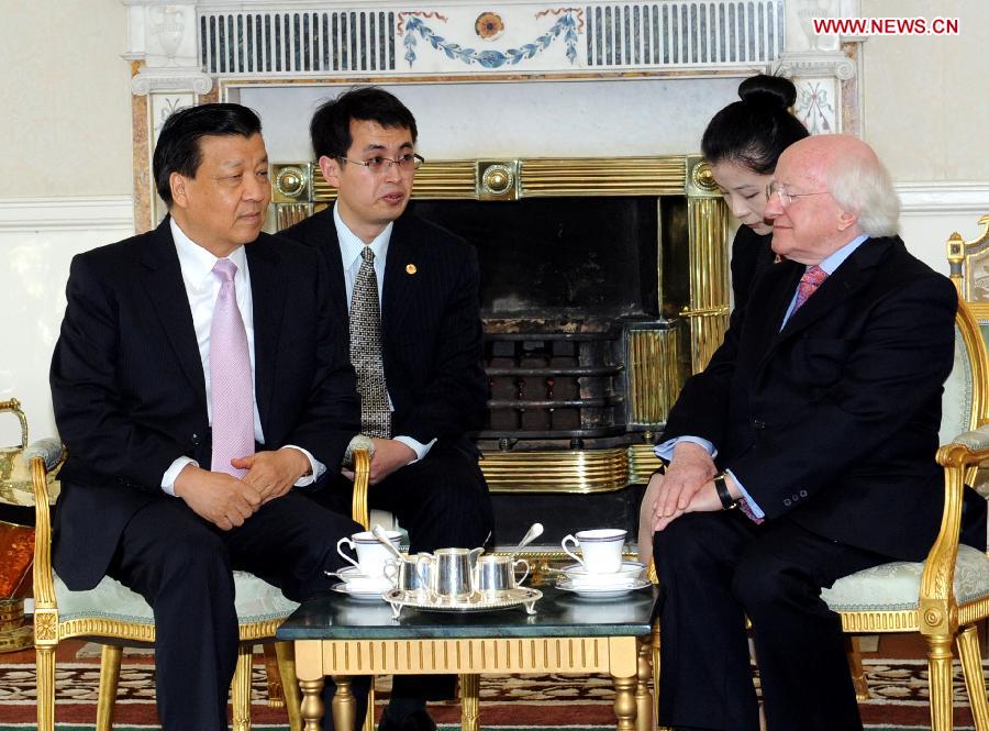 | Liu Yunshan (R), a member of the Standing Committee of the Political Bureau of the Central Committee of the Communist Party of China, meets with Irish President Michael D. Higgins in Dublin, capital of Ireland, June 16, 2014. (Xinhua/Rao Aimin) |