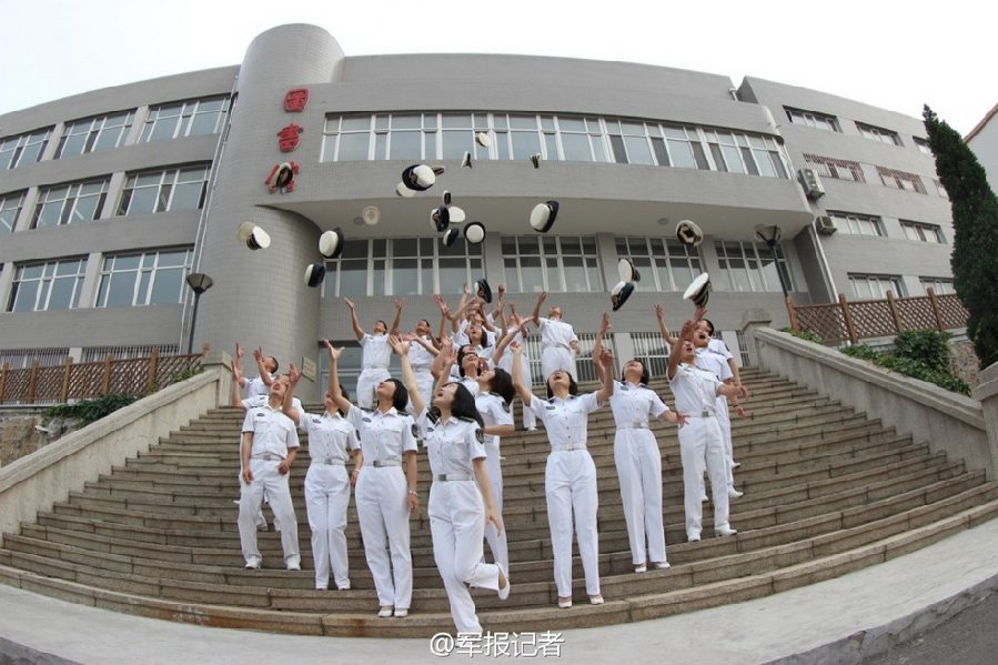 Cadets in PLA Dalian Naval Academy toss their hats at the conclusion of the graduation ceremony. (Photo source: Jie Fang Jun Bao)