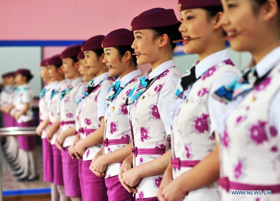 Stewardesses of CHR trains receive etiquette training in Chongqing, southwest China, June 18, 2014. As the CHR trains heading from southwest China's Chongqing and Sichuan to eastern China will soon be opened, a total of 169 stewardesses are busy with receiving training. (Xinhua/Cao Ning)