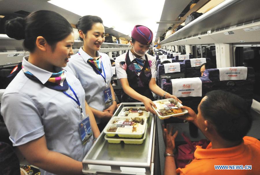 | Stewardesses serve passengers meal on a CHR train in Chongqing, southwest China, June 18, 2014. As the CHR trains heading from southwest China's Chongqing and Sichuan to eastern China will soon be opened, a total of 169 stewardesses are busy with receiving training. (Xinhua/Cao Ning) |