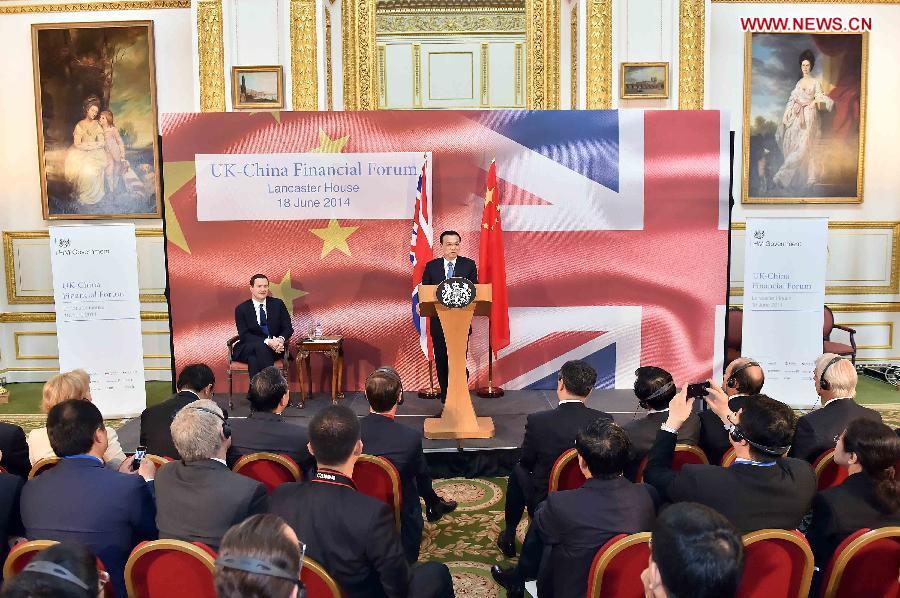 | Chinese Premier Li Keqiang (R, back) and British Chancellor of the Exchequer George Osborne (L, back) attend the UK-China Financial Forum in London, capital of Britain, June 18, 2014. (Xinhua/Li Tao) |
