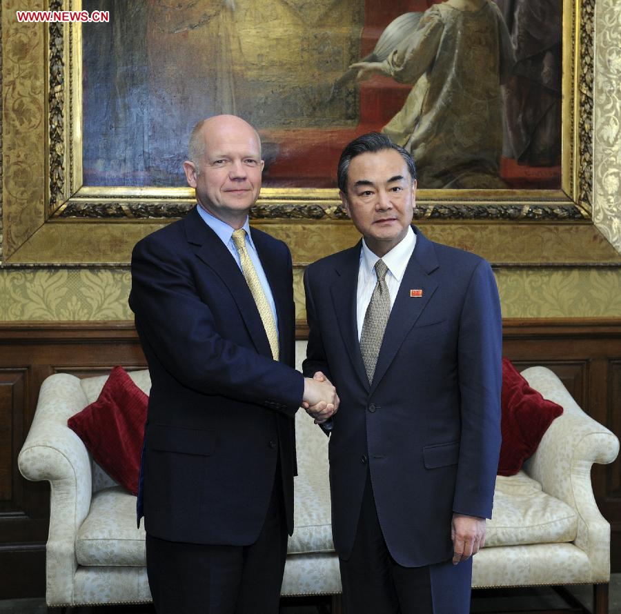 Meeting on the sidelines of Premier Li Keqiang's ongoing official visit to Britain, Wang and Hague exchanged views on the China-Britain relationship and global and regional hot-button issues.