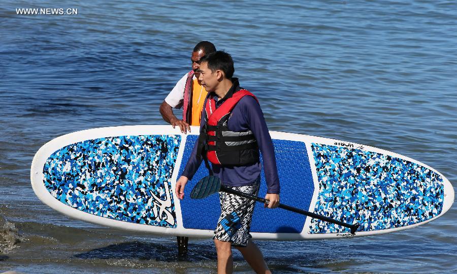 A man returns to land after surfing in the sea in Nadi, Fiji, June 18, 2014. Nadi is located on the west of the island Viti Levu in Fiji. (Xinhua/Li Peng)