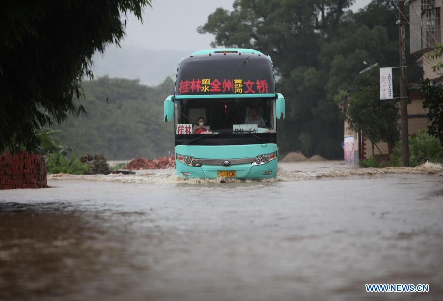 A bus runs on a flooded road in Quanzhou County of Guilin City, south China's Guangxi Zhuang Autonomous Region, June 20, 2014. A rainstorm hit several cities in Guangxi and local weather bureau has launched an emergency response. (Xinhua/Wang Zichuang)