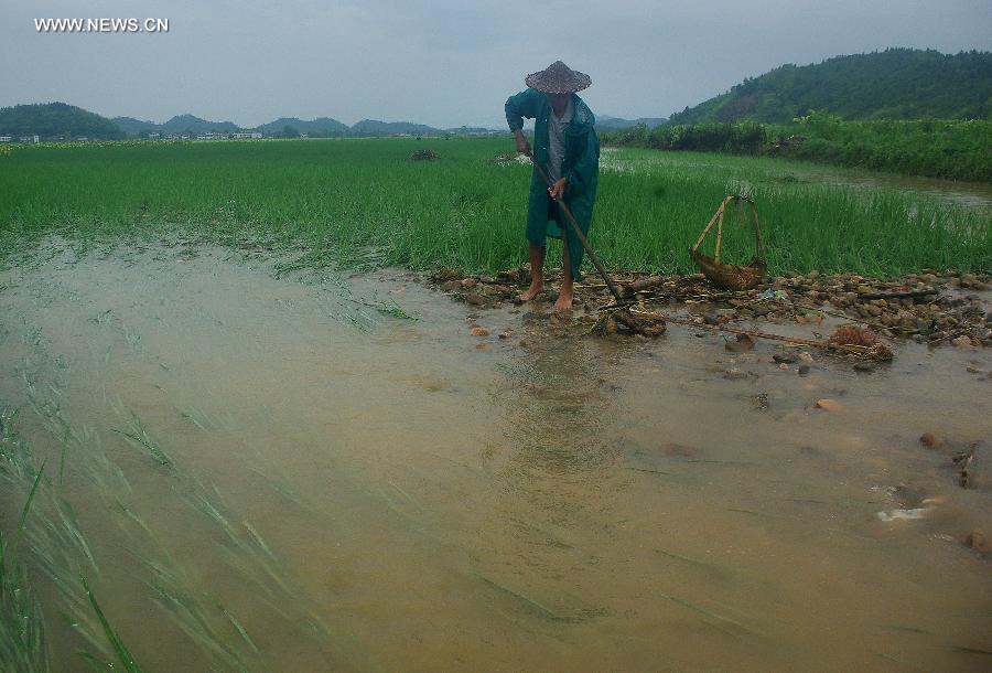 | A farmer clears a waterlogged field at Liming Village in Fuzhou City, east China's Jiangxi province, June 20, 2014. More than 2,700 people were evacuated after downpours battered Fuzhou City on Thursday and early Friday. (Xinhua/Wan Limin) |
