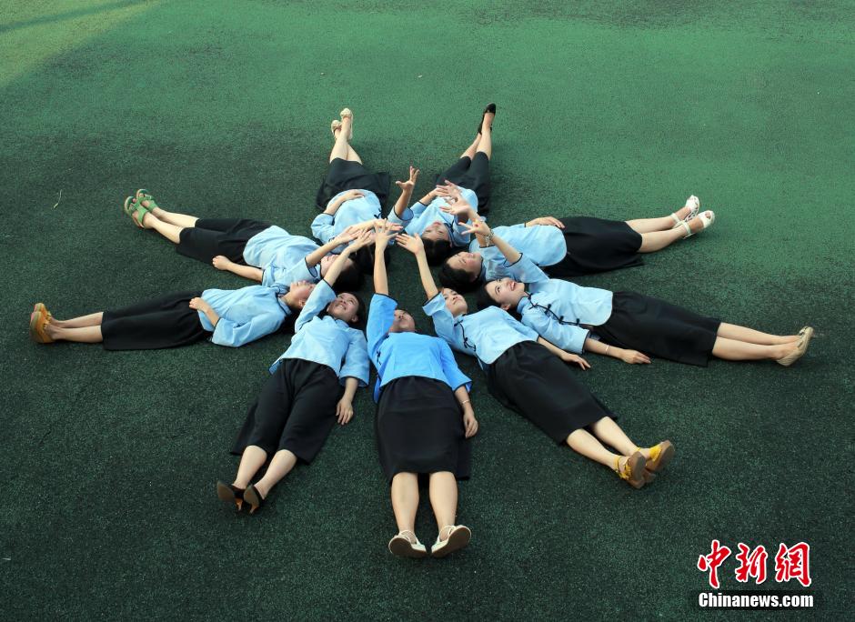 Some graduates in Sichuan University of Arts and Science take group photos themed "Youth never ends" to mark their graduation, June 17, 2014. They wore costumes of the Republic of China period and put on a variety of poses to commemorate the good times spent at the university. (Chinanews.com/Wan Yanming)