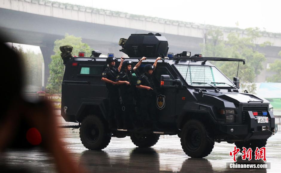 On June 18, Public Security Department of Jiangsu announced that the province will send 22,000 police officers to patrol 965 populated positions every day. They are equipped with 1,900 guns and 3,200 police cars. Armed patrol in Jiangsu began in March and has now been expanded to almost every city. The Police Tactical Unit (PTU) is equipped with armored vehicles, explosion-proof cars and assault vehicles. (CNS/Yang Bo)