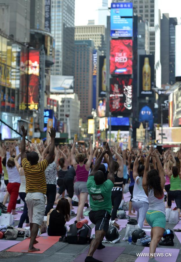 Enthusiasts practice yoga during the "Solstice in Times Square" event at Times Square in New York, the United States, June 21, 2014. Hundreds of New Yorkers marked the Summer solstice day by practicing yoga in Times Square Saturday. The 12th annual Solstice in Times Square was sponsored by the Times Square Alliance. (Xinhua/Wang Lei)