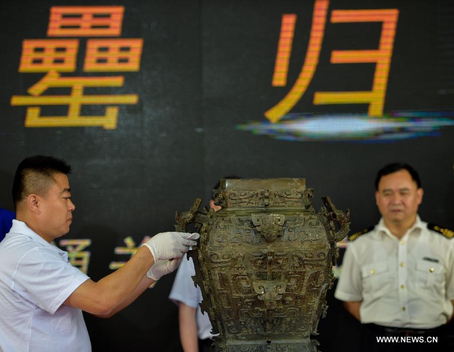 Staff members unpack the Min Fanglei of the Customs Supervised Warehouse in the airport of Changsha, capital of central China's Hunan Province, June 21, 2014. Lei was a kind of ritual vessel and wine container in the late Shang Dynasty (1600 BC-1046 BC) and early Zhou Dynasty (1046 BC - 771 BC) in China. The Min Fanglei, which got its name Min from the inscriptions on it, is the most exquisite and largest Lei ever unearthed. The body of Min Fanglei has been separated from its lid since its was unearthed in 1919 in Taoyuan County of Hunan. The famous bronzeware, which has been away from its home for almost a century, returned home Saturday after being purchased from an overseas owner in March. (Xinhua/Bai Yu)