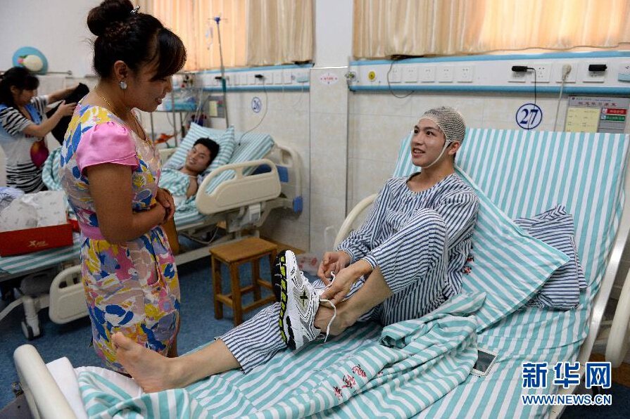Liu tries his shoes with the help of Yi's aunt on June 14, 29014. Yi's aunt bought shoes for both Liu and Yi. They will dress like brothers when they leave the hospital together. (Photo/ Chen Zixia)