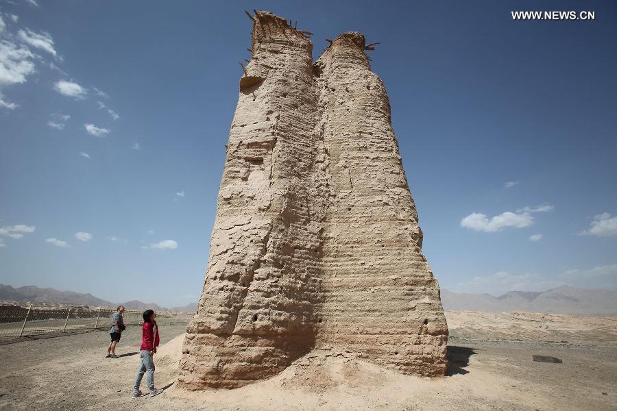 Photo taken on Aug. 29, 2013 shows the Kirzierduoha Beacon Fire Tower, northwest China's Xinjiang Uygur Autonomous Region. The famous ancient Silk Road, which served as a corridor for trade and cultural exchanges between Asia and Europe dating back to 2,000 years ago, was inscribed on the World Heritage list at Doha, capital of Qatar on June 22, 2014. Jointly submitted by China, Kazakhstan and Kyrgyzstan, the application for adding part of the millennium-old trade route to the UNESCO list was approved by the World Heritage Committee which convened its 38th session in Doha. (Xinhua)