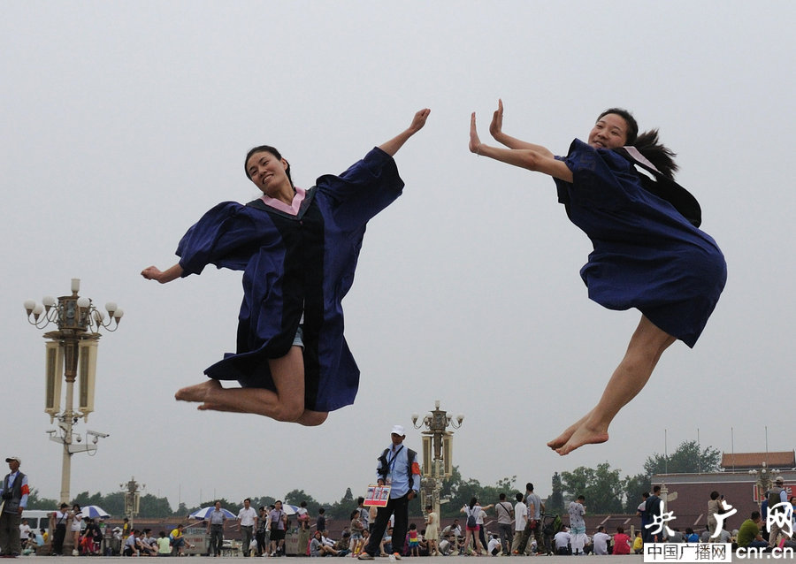 College girls take creative graduation photos at the Tiananmen Square, Beijing, June 19, 2014. (Photo: cnr.cn)