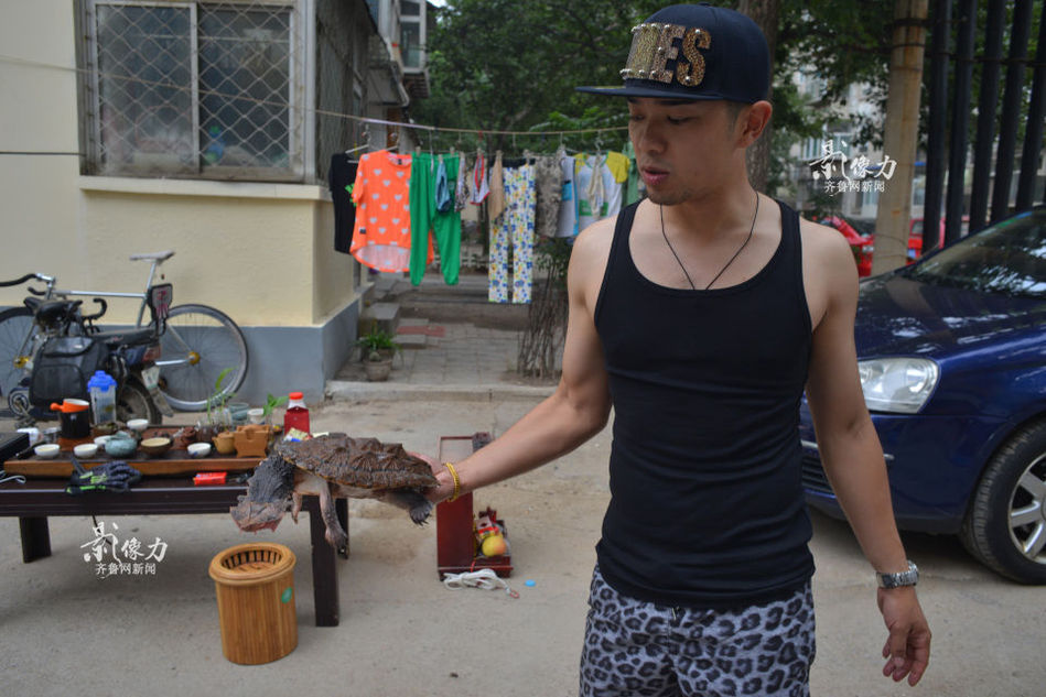 Zheng keeps several tortoises in his shop. (iqilu.com/Yu Peng)