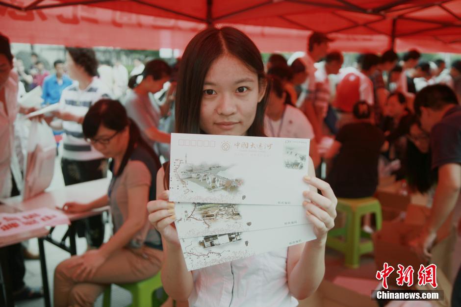 In celebration of the Grand Canal's inclusion on the World Heritage list, a ceremony for the issuance of a series of stamps and commemorative envelopes with ten scenes of the Grand Canal drawn by famous artists is held in Hangzhou, east China's Zhejiang Province, June 23, 2014. Each set is composed of three envelopes with the words "China's Grand Canal has been inscribed on the World Heritage List". At most 20,000 sets will be issued in Zhejiang Province. (Chinanews.com/Li Chenyun)