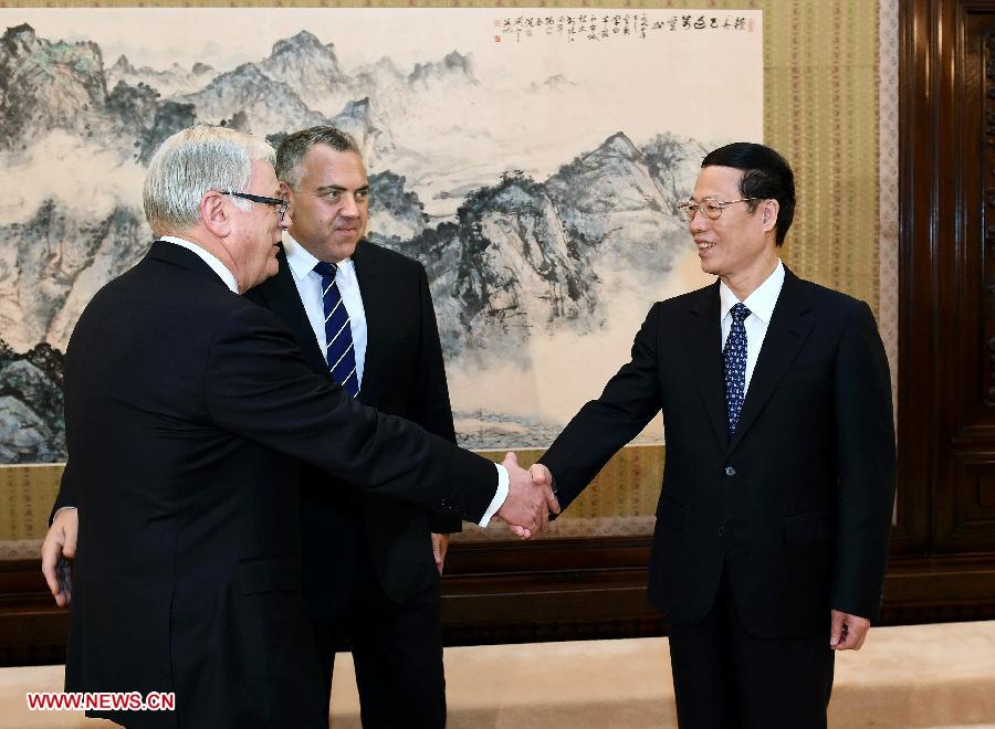 Chinese Vice Premier Zhang Gaoli (R) meets with Australian Treasury Minister Joe Hockey (C) and Trade and Investment Minister Andrew Robb in Beijing, China, June 24, 2014. (Xinhua/Liu Jiansheng)