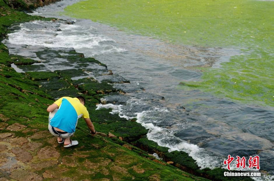 On June 23, large quantities of green algae known as enteromorpha profiera hit the coast of Qingdao, eastern China’s Shandong Province. This is the seventh year since 2008 that green algae have sprouted here. At present, operations are being carried out to remove the green algae. (CNSPHOTO)
