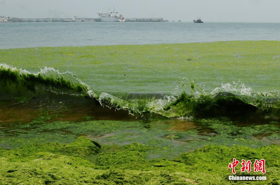 On June 23, large quantities of green algae known as enteromorpha profiera hit the coast of Qingdao, eastern China’s Shandong Province. This is the seventh year since 2008 that green algae have sprouted here. At present, operations are being carried out to remove the green algae. (CNSPHOTO)