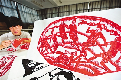 Chang Yangyang, 23, artist, recreates images of World Cup heroes with black and red paper-cutting works in Mengjin county, central China's Henan province, June 22, 2014. (Photo/ People’s Daily Oversea Edition)