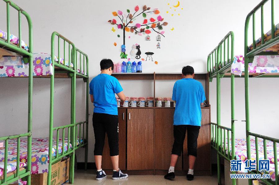 Two recovering addicts tidy the room in the third compulsory rehabilitation center, northwest China's Ningxia Hui Autonomous Region, June 24, 2014. (Xinhua/Chen Junqing)