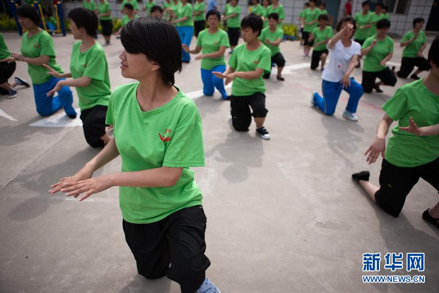 Recovering addicts dance during a rehearsal in the third compulsory rehabilitation center, northwest China's Ningxia Hui Autonomous Region, June 24, 2014. (Xinhua/Chen Junqing)