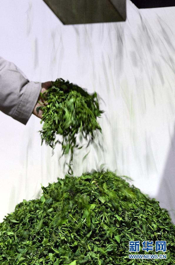 Tea leaves are poured from rolling machine. The photo was taken on April 23, 2014. (Photo/Xinhua)