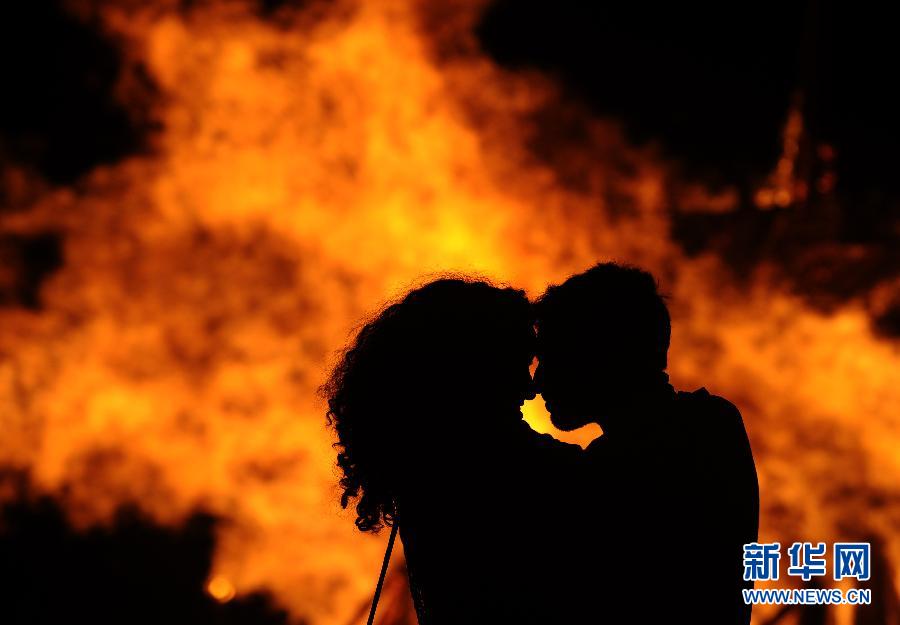 A couple embraces during a party held on the night of the San Juan bonfire on the beach of Playa de Poniente in Gijon early June 24, 2014. (Xinhua/Reuters)