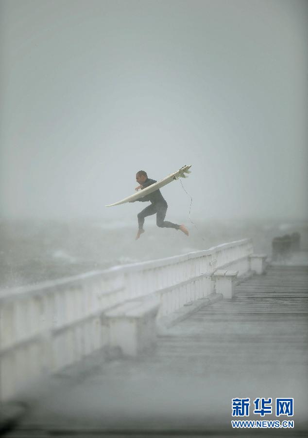 A surfer jumps off the pier into Port Phillip Bay to take advantage of the waves as a strom lashes the Malbourn area in Australia. (Xinhua/AFP)