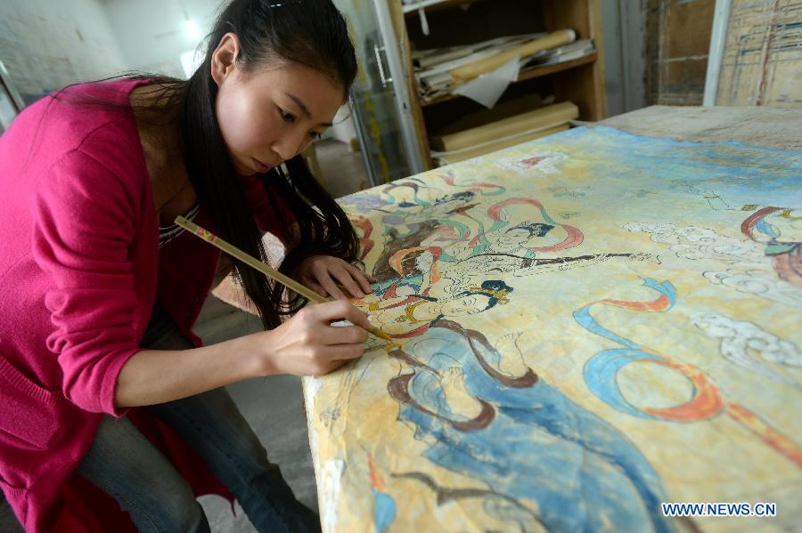 A painter draws a mural painting at a studio in Yuequan Town, Dunhuang City, northwest China's Gansu Province, June 27, 2014. Attracted by the art form of Mogaoku Grottos mural, more and more young artists gathered in Dunhuang to learn for mural creation and set up their studios. (Xinhua/Nie Jianjiang)