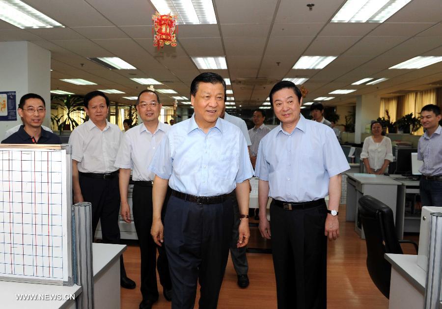 Liu Yunshan (C front), a member of the Standing Committee of the Political Bureau of the Communist Party of China (CPC) Central Committee and secretary of the Secretariat of the CPC Central Committee, visits working staff of People's Daily in Beijing, capital of China, June 29, 2014. Liu made an inspection tour to People's Daily on Sunday. (Xinhua/Rao Aimin)