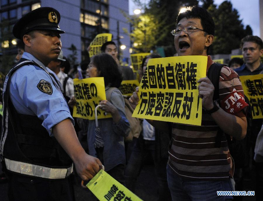 People attend a rally to protest against the attempt to exercise the rights to collective self-defense in front of the Prime Minister's official residence in Tokyo, Japan, June 30, 2014. Thousands of Japanese people gathered here Monday, protesting against Japanese Prime Minister Shinzo Abe's attempt to allow Japan's Self-Defense Forces (SDF) to exercise the rights to collective self-defense. The Japanese government sought to get a green light from the Cabinet on July 1 for a resolution that will allow Japan to exercise collective self-defense rights through reinterpreting the country's pacifist Constitution. (Xinhua/Liu Tian)