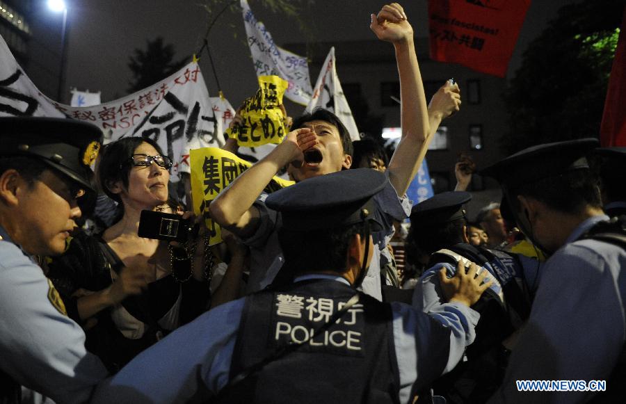People attend a rally to protest against the attempt to exercise the rights to collective self-defense in front of the Prime Minister's official residence in Tokyo, Japan, June 30, 2014. Thousands of Japanese people gathered here Monday, protesting against Japanese Prime Minister Shinzo Abe's attempt to allow Japan's Self-Defense Forces (SDF) to exercise the rights to collective self-defense. The Japanese government sought to get a green light from the Cabinet on July 1 for a resolution that will allow Japan to exercise collective self-defense rights through reinterpreting the country's pacifist Constitution. (Xinhua/Liu Tian)