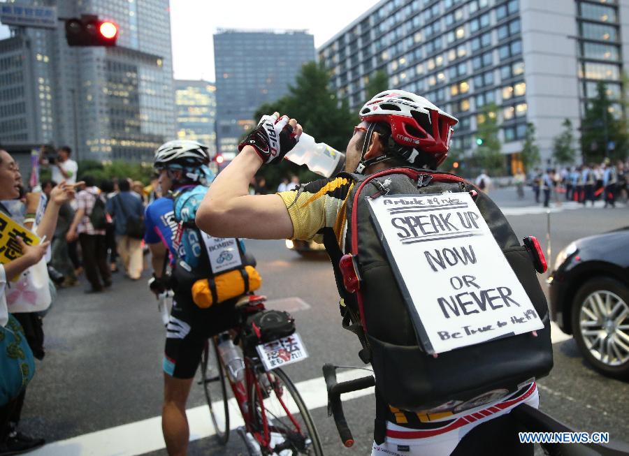 People attend a rally to protest against the attempt to exercise the rights to collective self-defense in front of the Prime Minister's official residence in Tokyo, Japan, June 30, 2014. Thousands of Japanese people gathered here Monday, protesting against Japanese Prime Minister Shinzo Abe's attempt to allow Japan's Self-Defense Forces (SDF) to exercise the rights to collective self-defense. The Japanese government sought to get a green light from the Cabinet on July 1 for a resolution that will allow Japan to exercise collective self-defense rights through reinterpreting the country's pacifist Constitution. (Xinhua/Liu Tian)