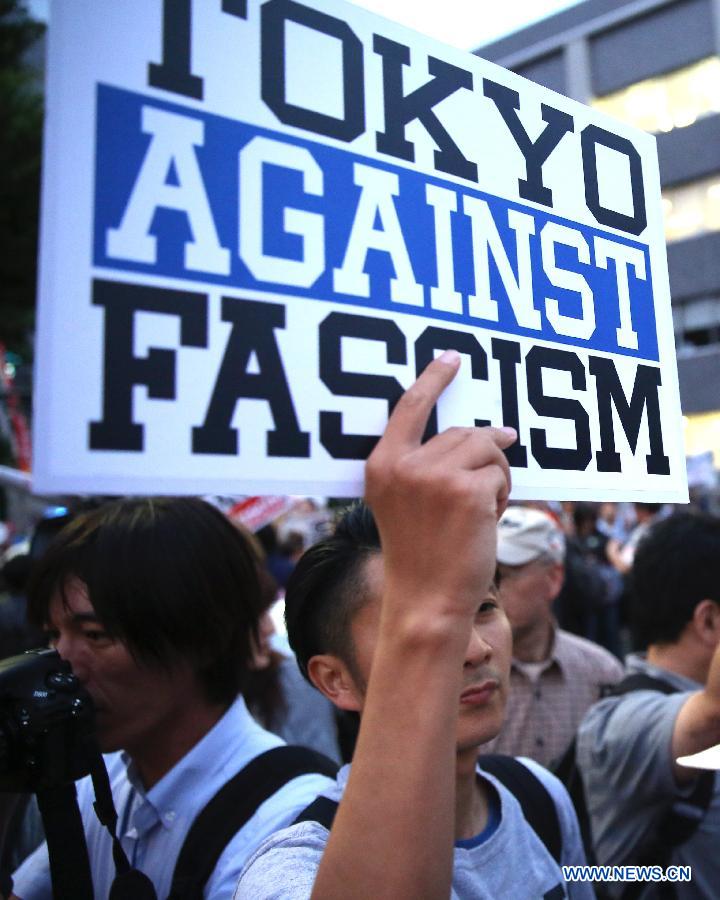 People attend a rally to protest against the attempt to exercise the rights to collective self-defense in front of the Prime Minister's official residence in Tokyo, Japan, June 30, 2014. Thousands of Japanese people gathered here Monday, protesting against Japanese Prime Minister Shinzo Abe's attempt to allow Japan's Self-Defense Forces (SDF) to exercise the rights to collective self-defense. The Japanese government sought to get a green light from the Cabinet on July 1 for a resolution that will allow Japan to exercise collective self-defense rights through reinterpreting the country's pacifist Constitution. (Xinhua/Liu Tian)