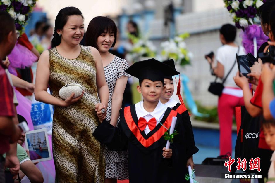 Children accompanied by their parents walk the red carpet at the graduation ceremony of a kindergarten in Qingdao in east China's Shandong province on June 28, 2014. The children signed their names on the board, like the shining stars. (Photo/CNS)