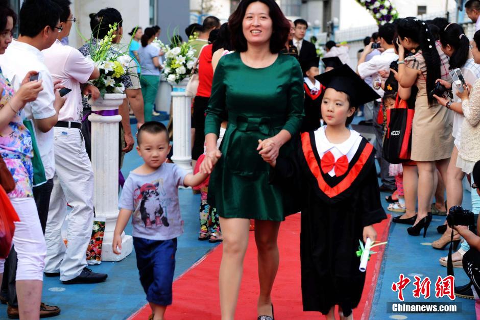 Children accompanied by their parents walk the red carpet at the graduation ceremony of a kindergarten in Qingdao in east China's Shandong province on June 28, 2014. The children signed their names on the board, like the shining stars. (Photo/CNS)