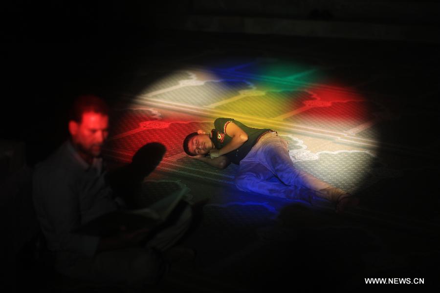 A Palestinian boy takes a nap at a Mosque in Gaza City on the third day of the Muslim fasting month of Ramadan, on July 1, 2014. Muslims around the world celebrate Ramadan, the holiest month in the Islamic calendar, in which they abstain from eating, drinking and conducting sexual relations from sunrise to sunset. (Xinhua/Wissam Nassar)