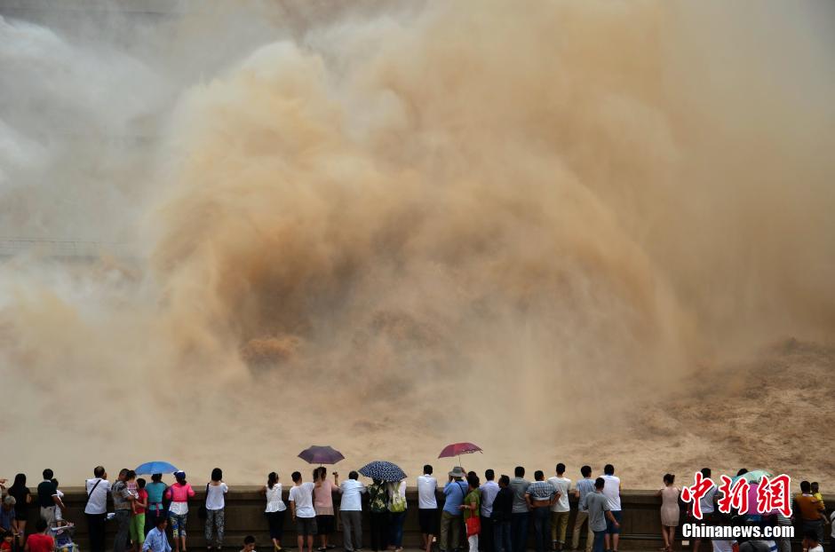 The sediment regulation begins at Xiaolangdi of Yellow River on June 30, 2014. The breathtaking landscape of rolling waves and towering waterfalls attracted visitors across the country. (Photo/CNS)
