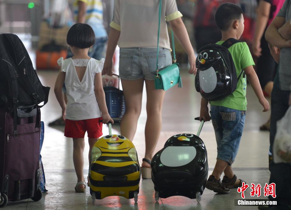 Migrant kids shepherded by their parents at a train station in Fuzhou, capital of southeast China’s Fujian province. (Photo/Chinanews.com)