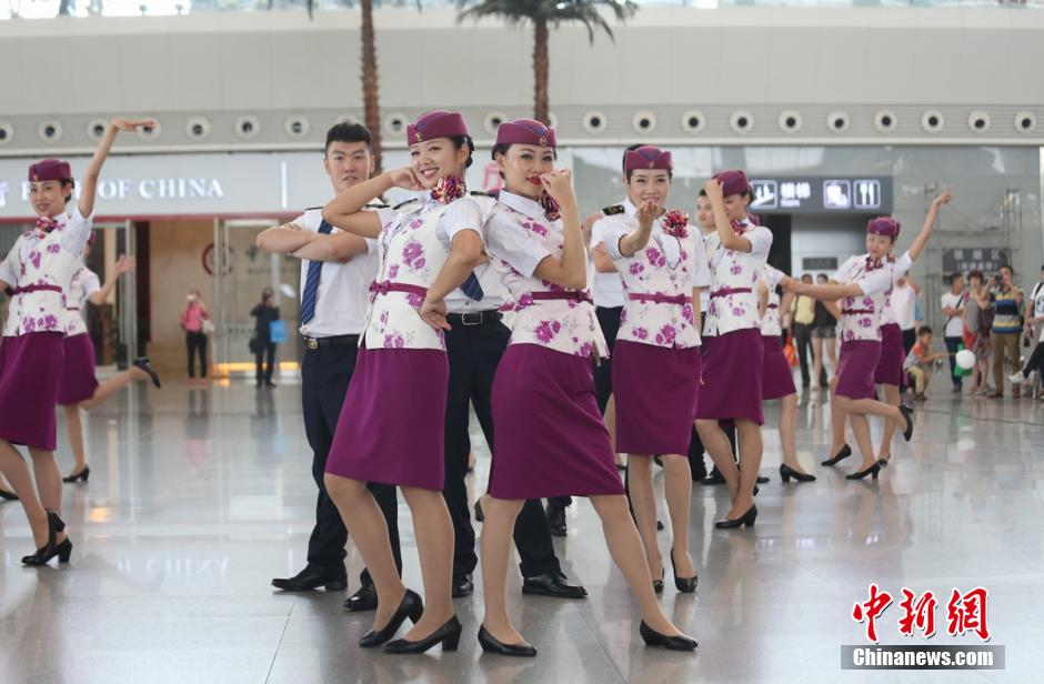 More than one hundred staff members of the Chengdu East Railway Station stage a flash mob dance to celebrate the operation of high-speed trains from Chengdu to Shanghai, Nanjing, and Wuhan in Chengdu, capital of southwest China's Sichuan province on July 1, 2014. (Chinanews.com/Zhu Linlin)
