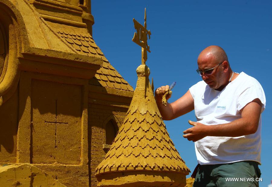 | A man gives a final touch to a sand sculpture during the Sand Sculpture Festival in Oostende, Belgium, July 2, 2014. About 150 sculptures created by more than 30 professional sand artists from about 10 countries were shown in the sand sculpture festival which would be held till the end of August. (Xinhua/Gong Bing) |
