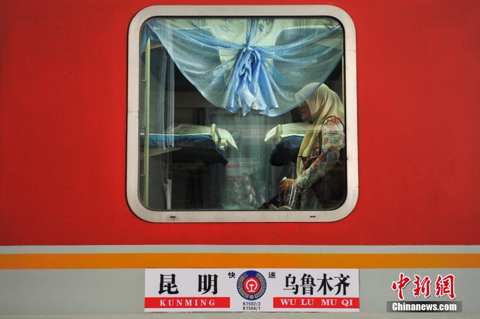 Passengers take train from Kunming to Urumqi at the Kunming Railway Station on July 1, 2014. The new operation diagram was implemented in the national railway across the country on the day. The train from Kunming to Urumqi which covers 4,220 kilometers; it has the longest one-way running time of 66 hours. (Photo/CNS)