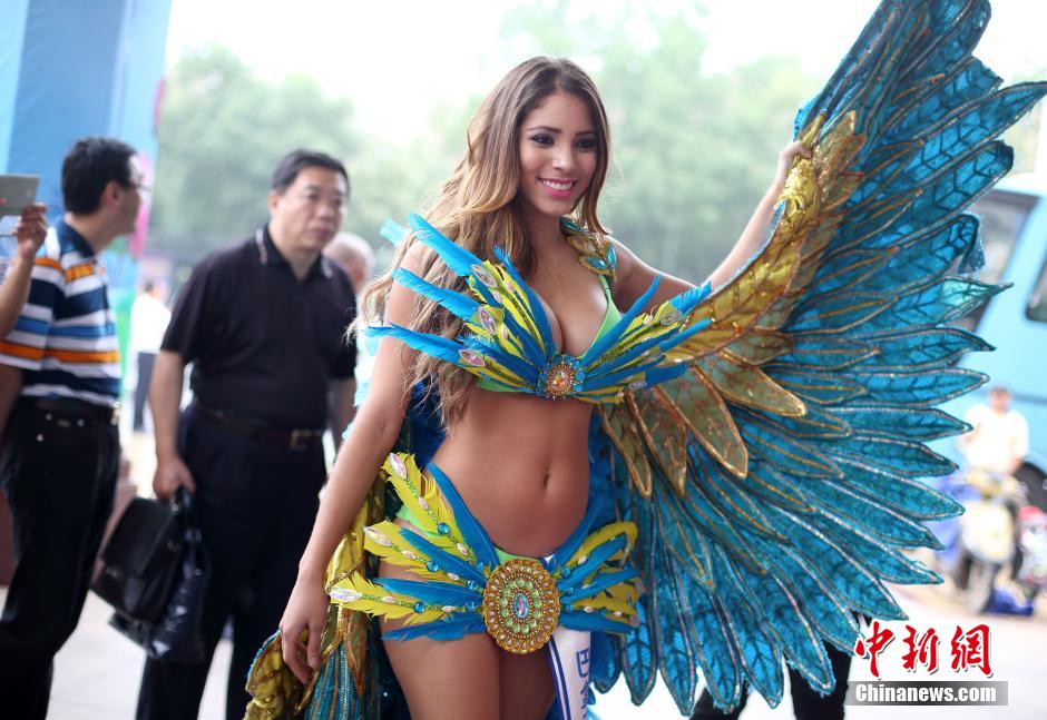 On July 1, 2014, global ambassadors of ecotourism from 42 countries including France, Australia, Panama, and Canada dressed in national costumes gather in Nanjing to raise the curtain of the world tour of culture. They will join promotion events to raise public's green awareness, and show support to the forthcoming 2014 Nanjing Youth Olympic Games during their stay in Nanjing. (Chinanews.com/ Yang Bo)