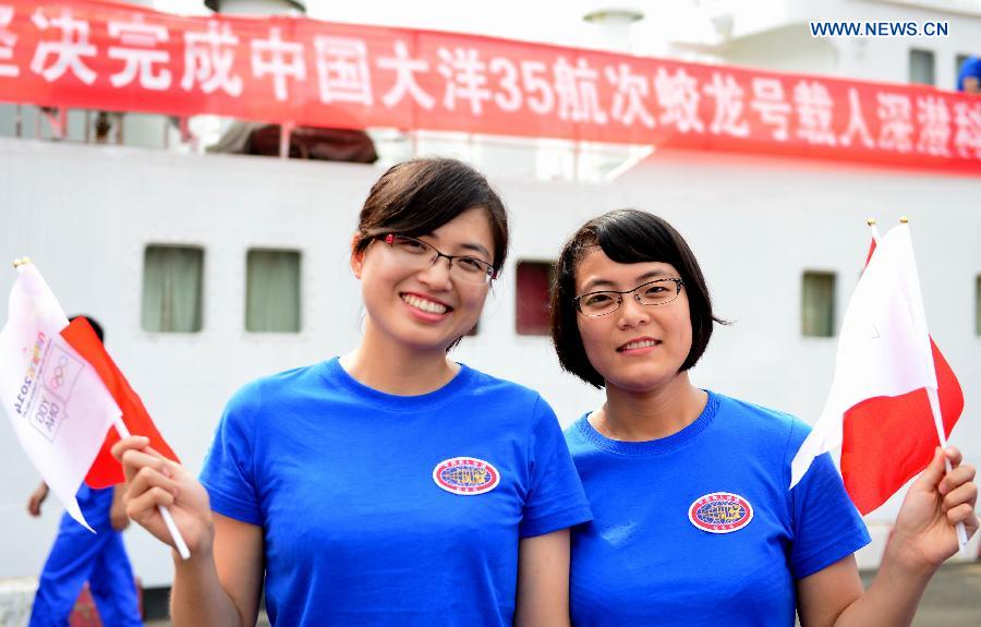 | Female aquanauts Zhang Yi (L) and Zhang Shengya wave flags on Xiangyanghong 09, carrier of Jiaolong, China's first manned deep-sea submersible, before setting sail from Fuzhou, capital of southeast China's Fujian Province, for the submersible's first expedition mission in the 2014-2015 period, July 4, 2014. Jiaolong on Friday embarked on a scientific expedition in the Pacific Ocean. It is scheduled for a voyage in the northwest Pacific Ocean, during which it will research cobalt-rich crusts and life forms inhabiting the bottom of the sea. (Xinhua/Wei Peiquan) |