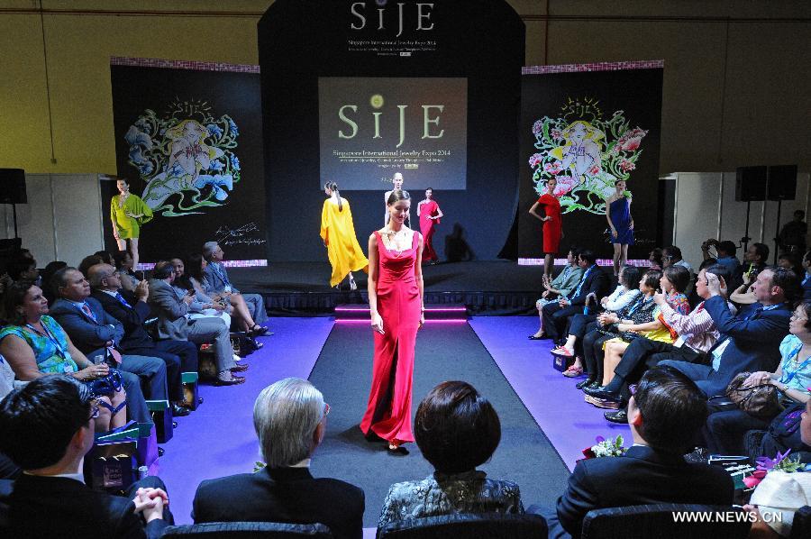 Models present jewelry creations at a fashion show during the Singapore International Jewelry Expo held in Singapore's Marina Bay Sands Expo, on July 3, 2014. The four-day Singapore International Jewelry Expo kicked off here Thursday. (Xinhua/Then Chih Wey)