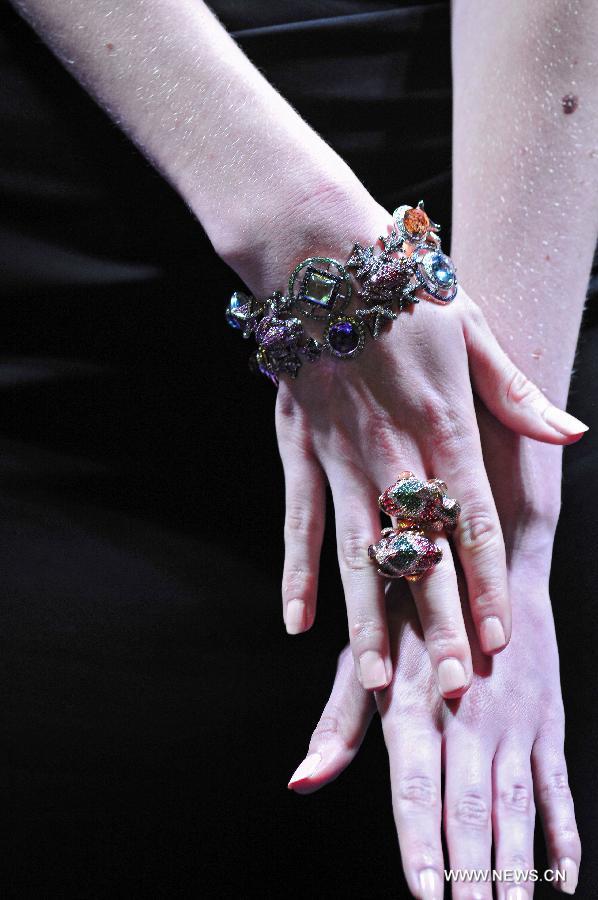 A model presents jewelry creations at a fashion show during the Singapore International Jewelry Expo held in Singapore's Marina Bay Sands Expo, on July 3, 2014. The four-day Singapore International Jewelry Expo kicked off here Thursday. (Xinhua/Then Chih Wey)
