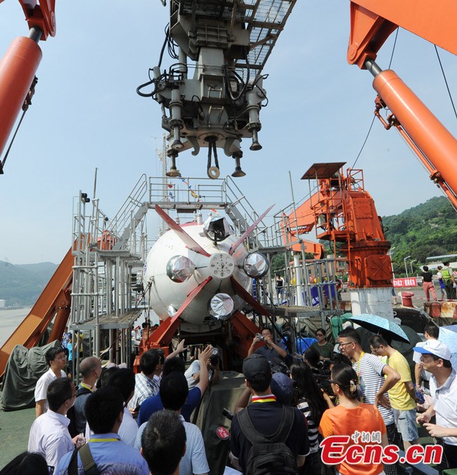 Residents visit China's manned deep-sea research submersible Jiaolong and its mother ship Xiangyanghong No. 9 in Fuzhou city of Fujian province on July 3, 2014.Jiaolong and its mother ship docked at Mawei port on July 1 and will leave for West Pacific Ocean for scientific research on Friday, July 4. (Source: Ecns.cn)